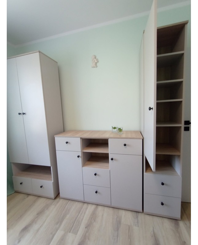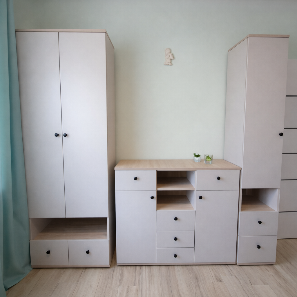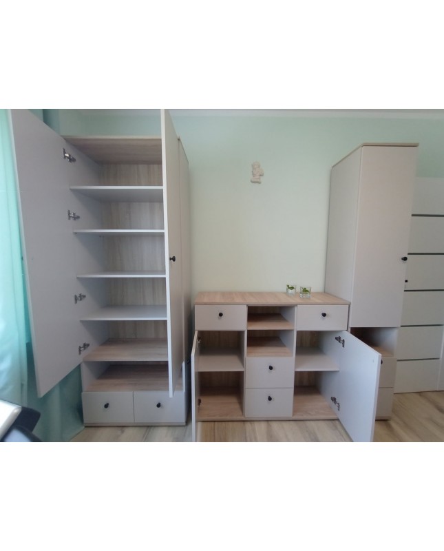 Elegancki i funkcjonalny zestaw mebli zaprojektowany z myślą o pokoju dziecięcym. Oferuje praktyczną przestrzeń do przechowywania ubrań, książek i zabawek, pomagając utrzymać porządek na co dzień. Stonowana kolorystyka w odcieniu kaszmiru wprowadza harmonię i przytulną atmosferę, a solidne wykonanie zapewnia trwałość i komfort użytkowania.