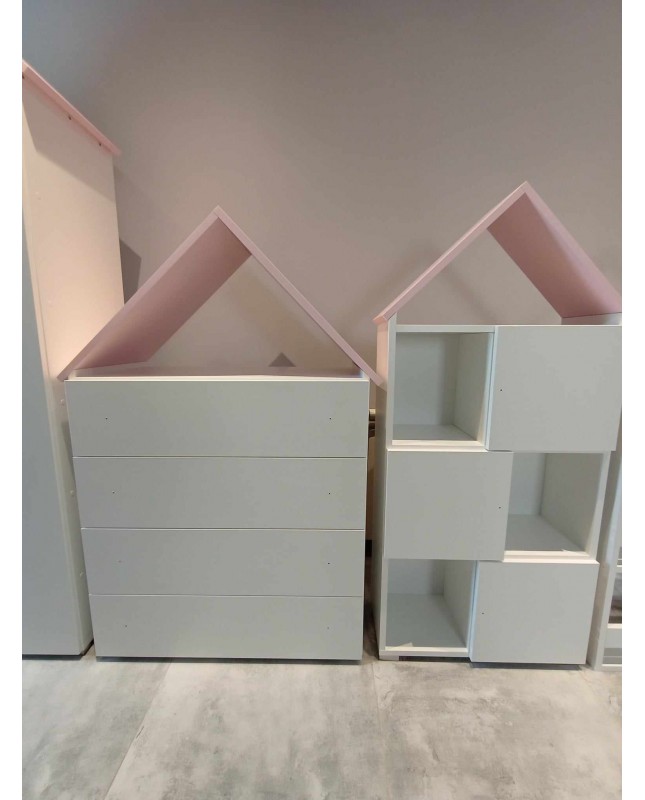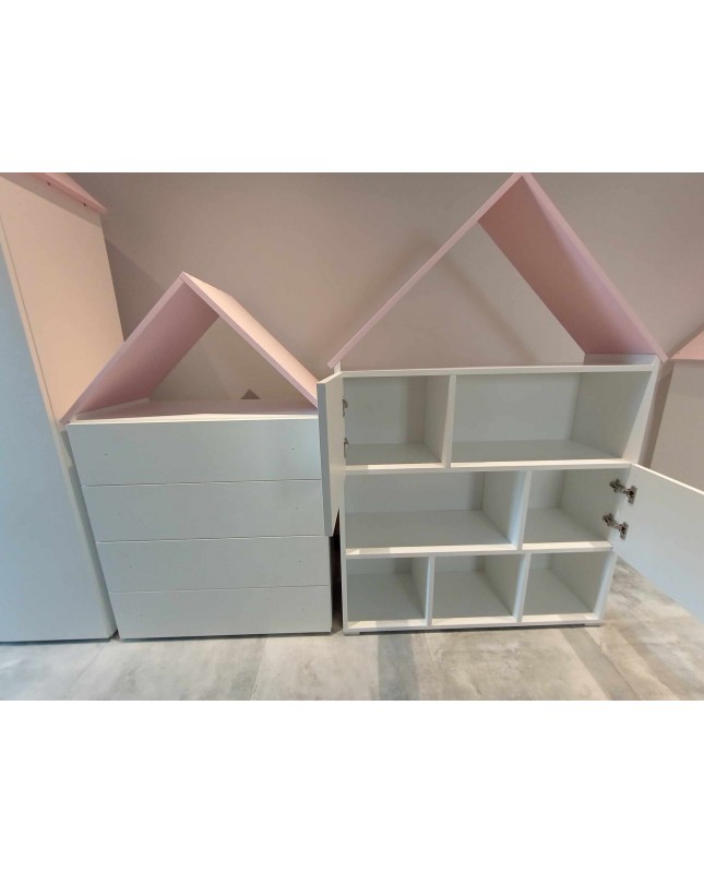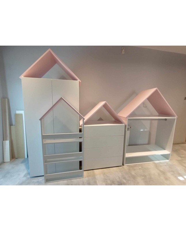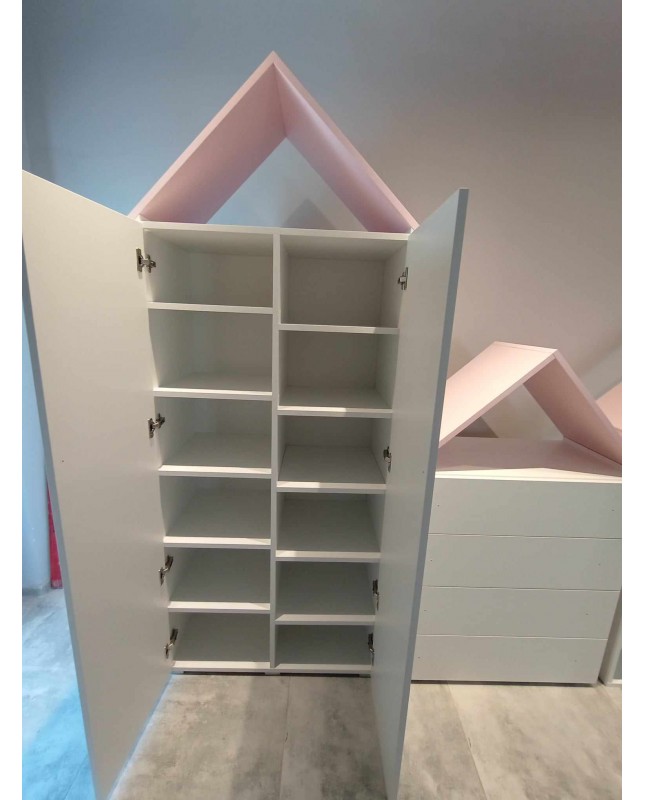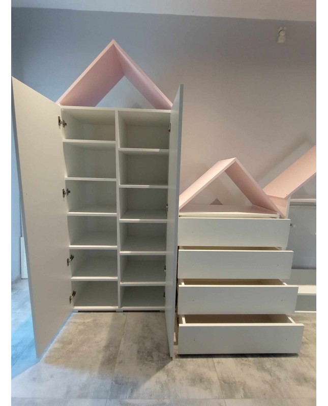Uroczy i praktyczny zestaw mebli, który doskonale sprawdzi się w pokoju dziecięcym lub młodzieżowym. Zapewnia dużo miejsca do przechowywania, pomaga utrzymać porządek i wprowadza przyjemny, jasny akcent do wnętrza. Solidne wykonanie gwarantuje trwałość i komfort użytkowania na co dzień.